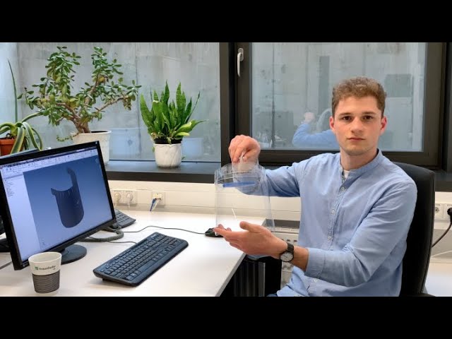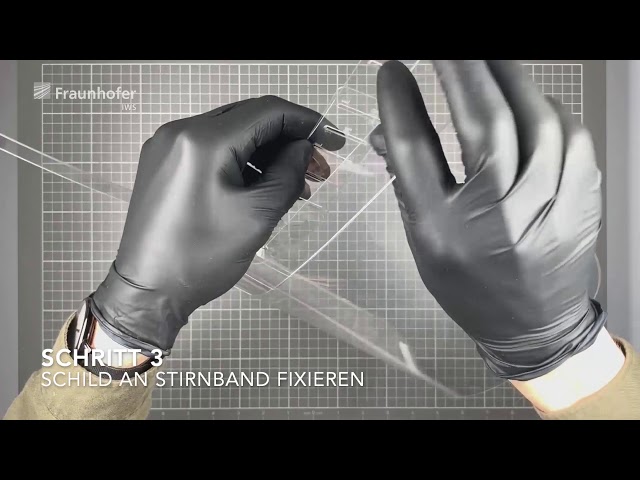 Nach kurzer Entwicklungszeit entstanden die ersten Prototypen des Gesichtsschilds »IWShield« an der Multi-Remote-Anlage »MuReA« des Fraunhofer IWS. Als Material kam überwiegend Polyethylenterephthalat (PET) zum Einsatz, ein thermoplastischer Kunststoff, aus dem zum Beispiel auch Trinkflaschen bestehen. PET ist aufgrund seiner Biokompatibilität, Temperaturbeständigkeit und Leichtigkeit in der Industrie beliebt. Zudem lässt es sich gut desinfizieren, mit Dampf sterilisieren und zu einem hohen Anteil recyceln. Das spezielle Design des »IWShield« ist auf einen mehrstündigen Einsatz ausgerichtet und gewährleistet einen hohen Tragekomfort. Die variablen Einstellmöglichkeiten der Stirnbänder verhindern ein Verrutschen, während das Überkopfband zusätzlich die seitliche Fixierung entlastet. Ein Klettband verbindet die Enden zwischen Kopf- und Stirnband. Das spezielle Design gewährleistet einen ausreichenden Abstand zu Mund und Nase, um ein Beschlagen zu verhindern. Das Schild besteht aus fünf Einzelteilen, die sich entsprechend der Kopfform und des Anwendungszwecks mit wenigen Handgriffen zusammenbauen und einfach reinigen lassen. Das Gewicht beträgt je nach Materialstärke lediglich 50 bis 100 Gramm.