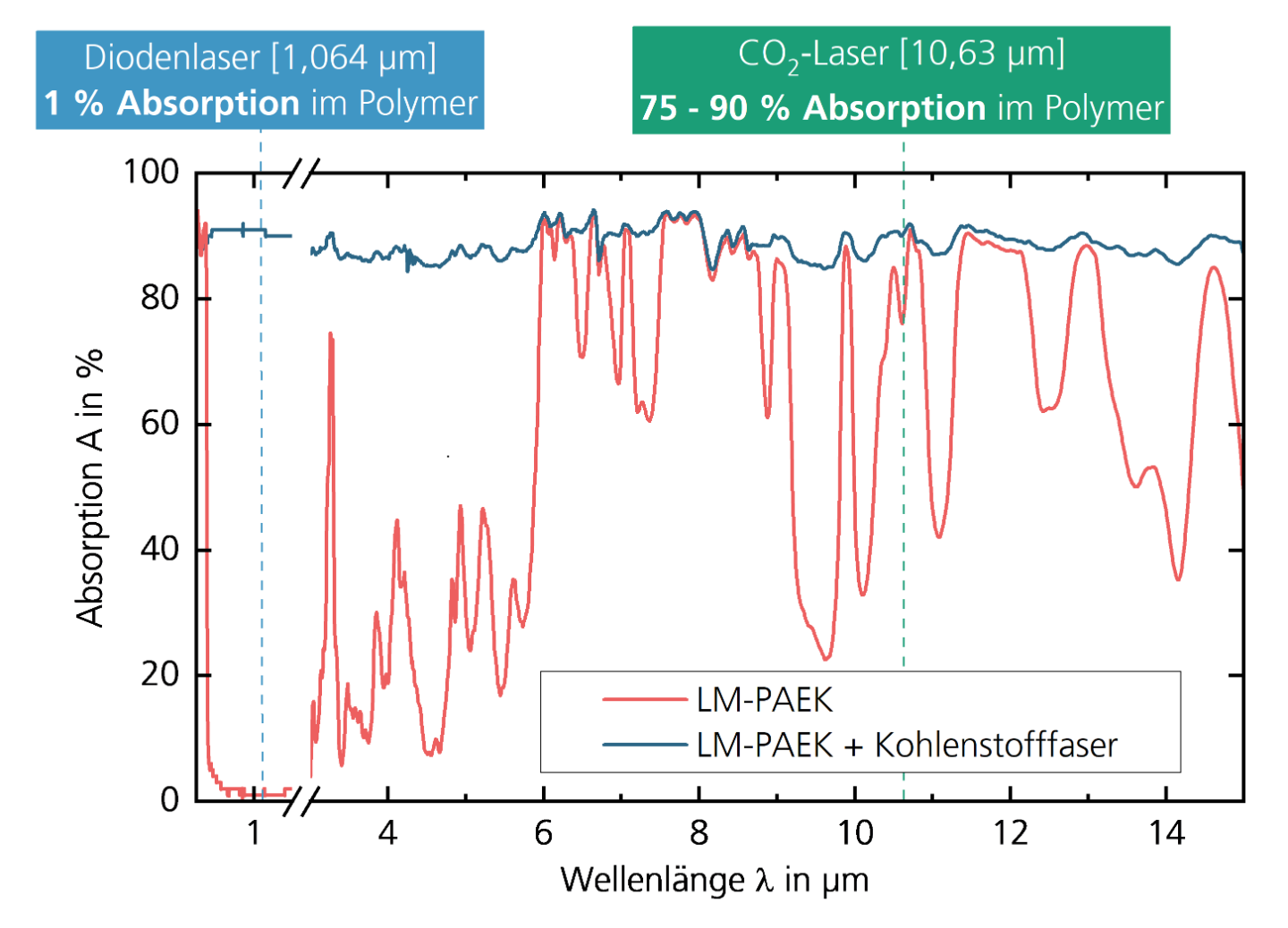 - Das im Rahmen vorheriger Projekte entwickelte CONTIjoin-Verfahren zum Fügen thermoplastischer multidirektionaler Laminathalbzeuge wird für die Verarbeitung weiterer Materialtypen ertüchtigt. Die hohe Absorption der verwendeten CO2-Laserstrahlung in der Polymermatrix ist ein vielversprechender Benefit hinsichtlich der thermischen Prozessführung im Vergleich zu den ausschließlich in den Kohlenstofffasern absorbierten Festkörper- und Diodenlasern, die in konventionellen Legeanlagen zum Einsatz kommen. Konkret werden die Potenziale der Technologie für das Fügen von unidirektionalen, einlagigen Halbzeugen (sog. Tapes, Ausgangsmaterial für gängige Technologien wie Automated Fiber Placement (AFP) bzw. der neuartigen Materialklasse der Vitrimere) untersucht, welche einen Hybrid zwischen Thermo- und Duroplast darstellen.
